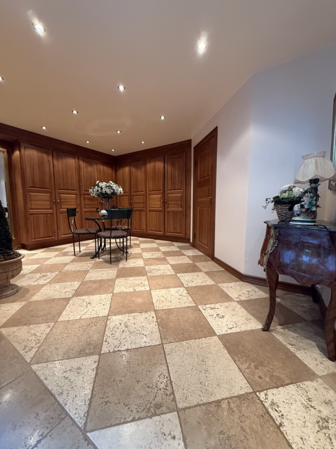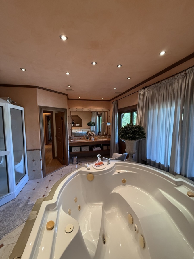 Im anderen Teil des Obergeschosses befinden sich das eklusive Badezimmer, in welchem ein großer Whirlpool steht sowie eine Dusche. Über die Balkontüren gelangt man auf einen überdachten Balkon.