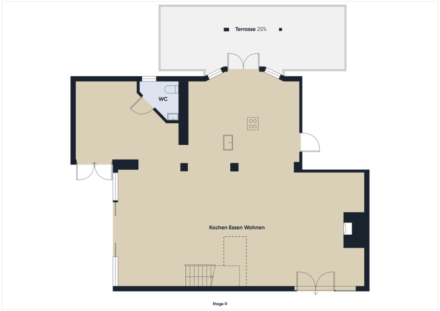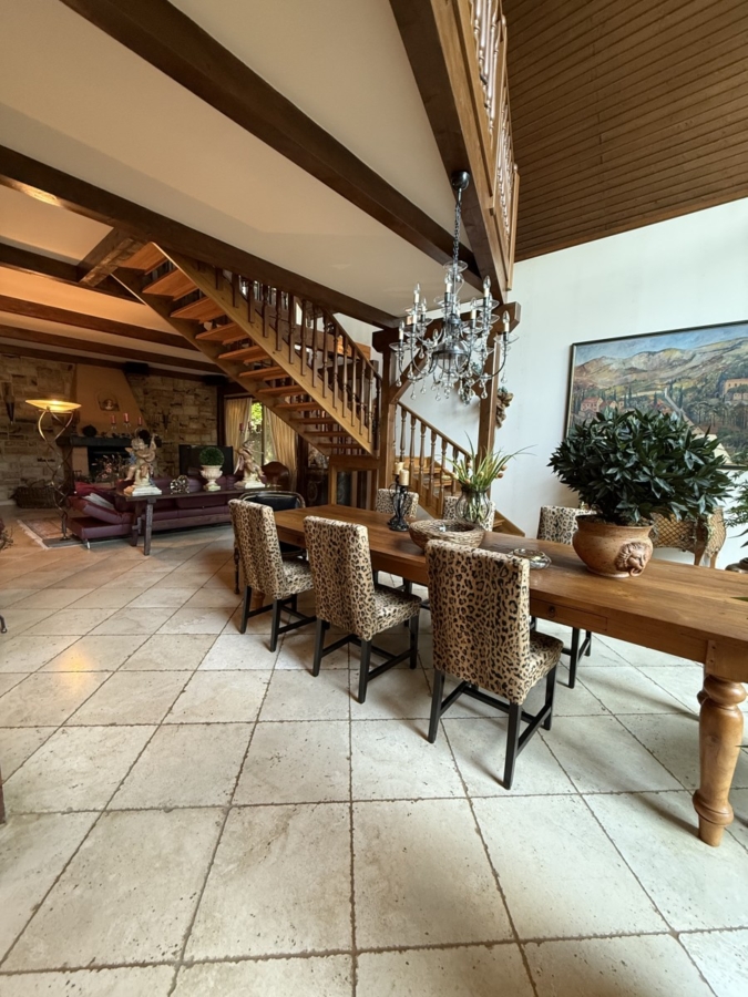 Auf der anderen Seite der Küche befindet sich der rustikal gestaltete Wohnbereich dessen Herzstück ein großer Kamin ist. Hier können Sie besonders im Winter gemütliche Abende verbringen. Durch den Essbereich der wegen der Glasfront über die komplette Giebelseite sehr hell ist, gelangt man über die zentral gelegene Holztreppe in das erste Obergeschoss.