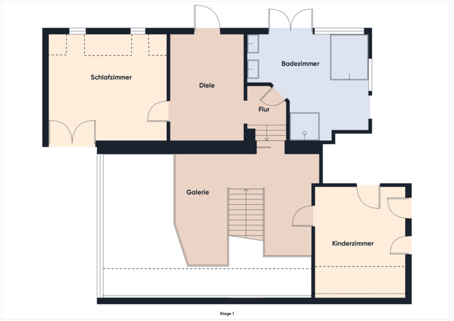 Hier befindet sich in der Galerie Platz für einen Schreibtisch im Anschluss gelangt man in das Kinderzimmer, das sich auch perfekt als Gästezimmer eignet und über ein eigenes Badezimmer mit Dusche verfügt.