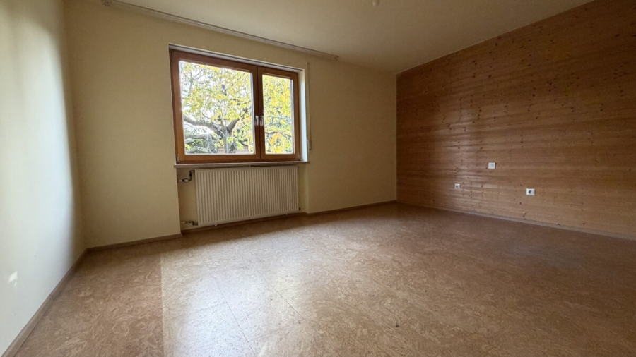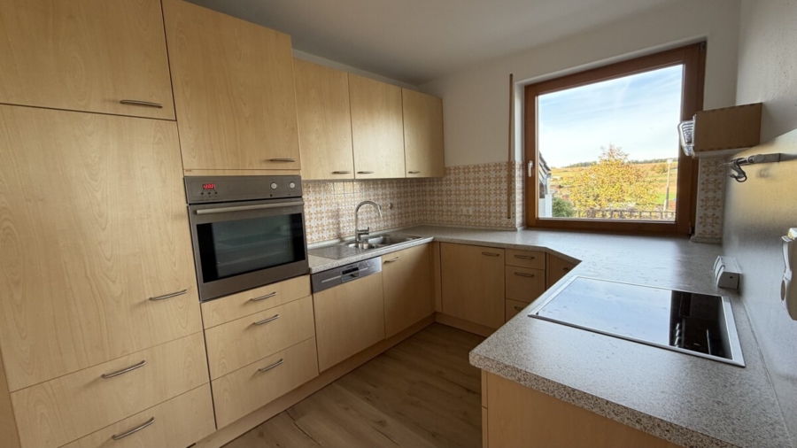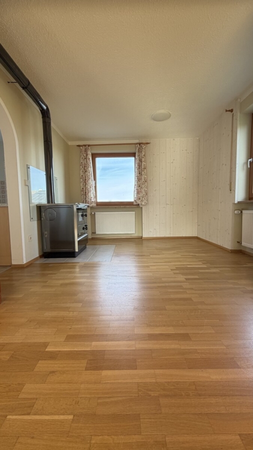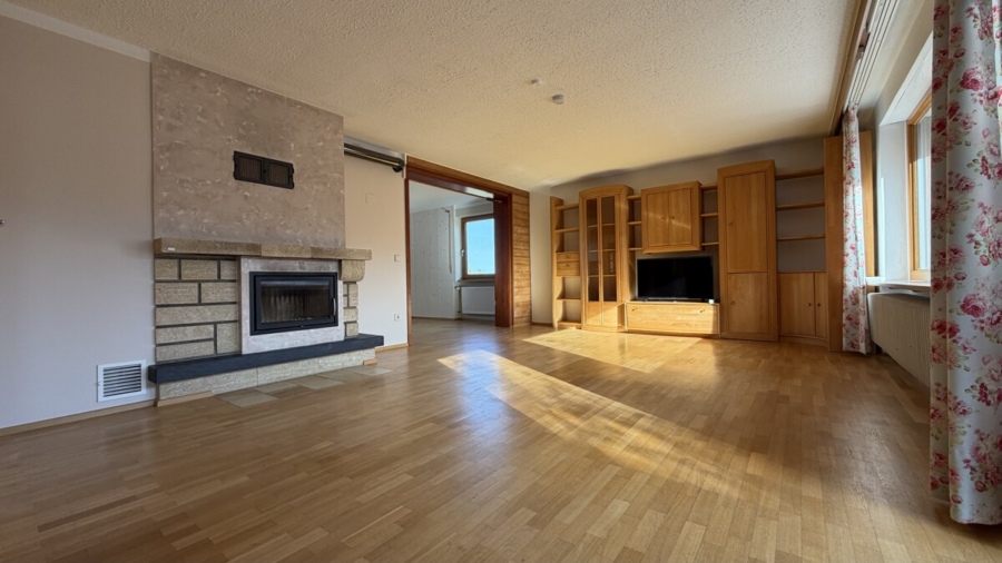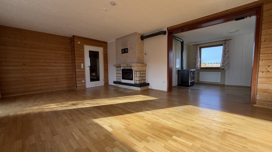 Im Erdgeschoss empfängt Sie ein mit Naturstein gefliester Eingangsbereich. Von hier aus gelangen Sie in das helle Wohnzimmer mit Massivholzparkett und großem Panoramafenster. Direkt angrenzend befinden sich der Essbereich sowie die Küche. Zwei Holzöfen sorgen für besondere Wohnqualität: ein Ofen im Essbereich zum Heizen und Kochen sowie ein Kamin im Wohnzimmer für gemütliche Stunden.