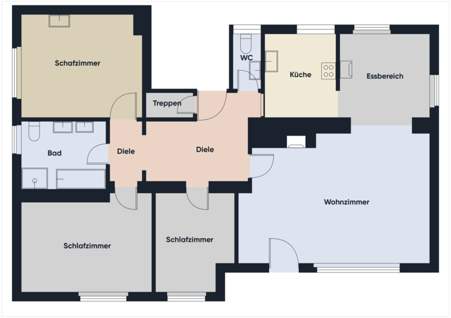 Ebenfalls im Erdgeschoss befinden sich ein Gäste-WC, ein Badezimmer mit Badewanne, Dusche und Fenster sowie drei weitere Zimmer, die flexibel als Schlaf-, Kinder- oder Arbeitszimmer genutzt werden können.